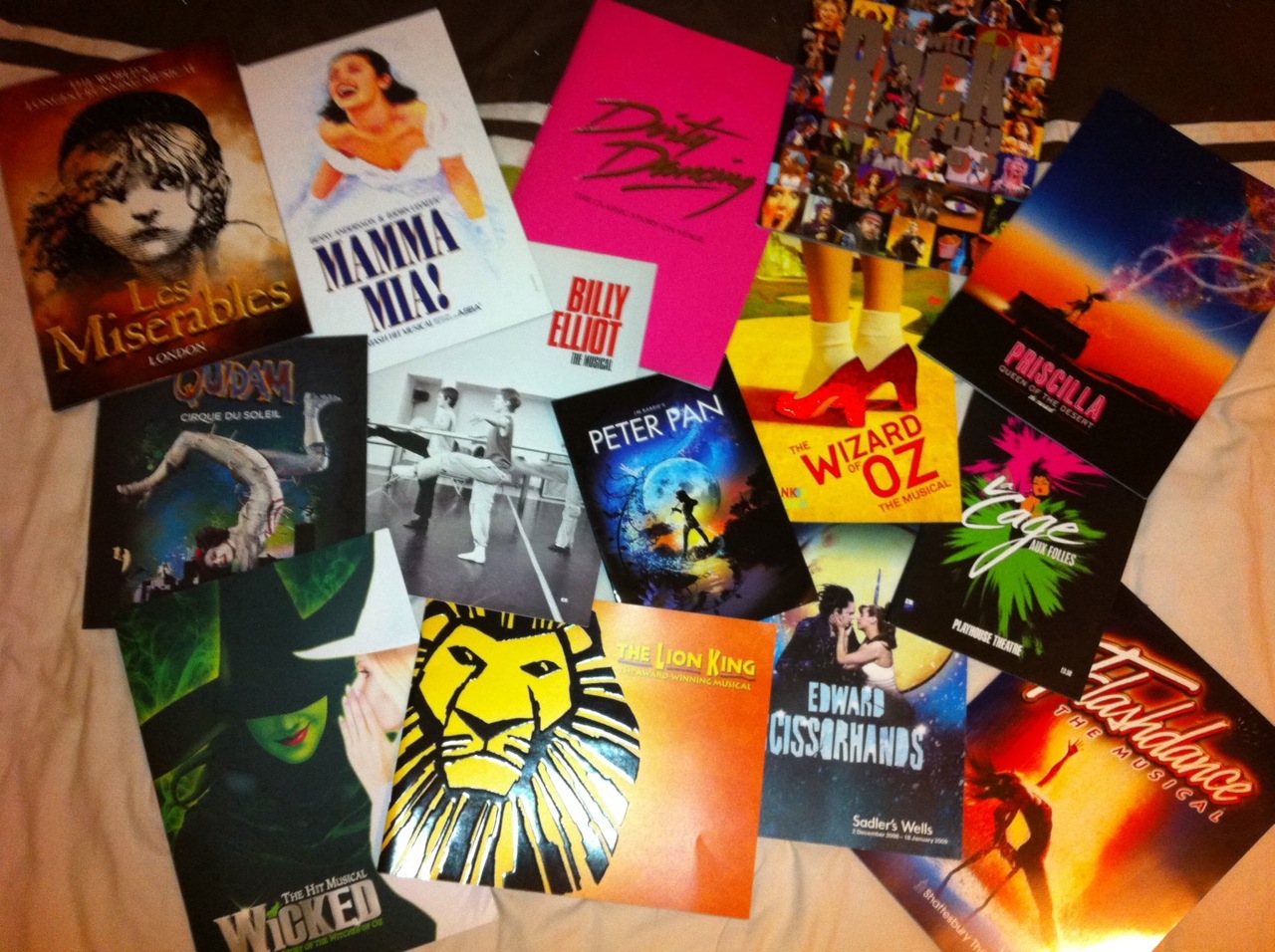 Pra quem quem gosta de teatro, o West End é uma tentação… Cada louco com sua mania, a minha é colecionar os programas de cada peça de teatro que eu assisto. Até agora, Billy Elliot, Lion King, Les Miserables, Mamma Mia!, Wizard of Oz, La Cage aux Follies, Flashdance, Priscilla, We Will Rock you, Dirty Dancing, Shrek, Blood Brothers.